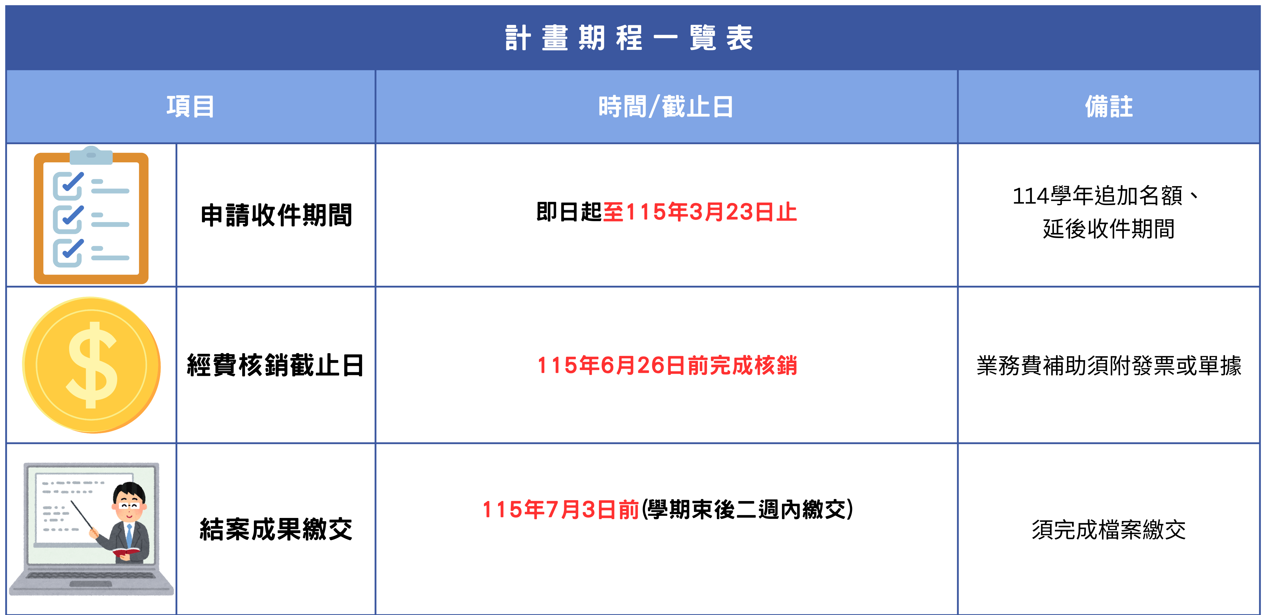 申請方式下載並填妥本計畫「附件一申請書」(點擊下方紫色按鍵下載),於收件截止日前e-mail予教務處
