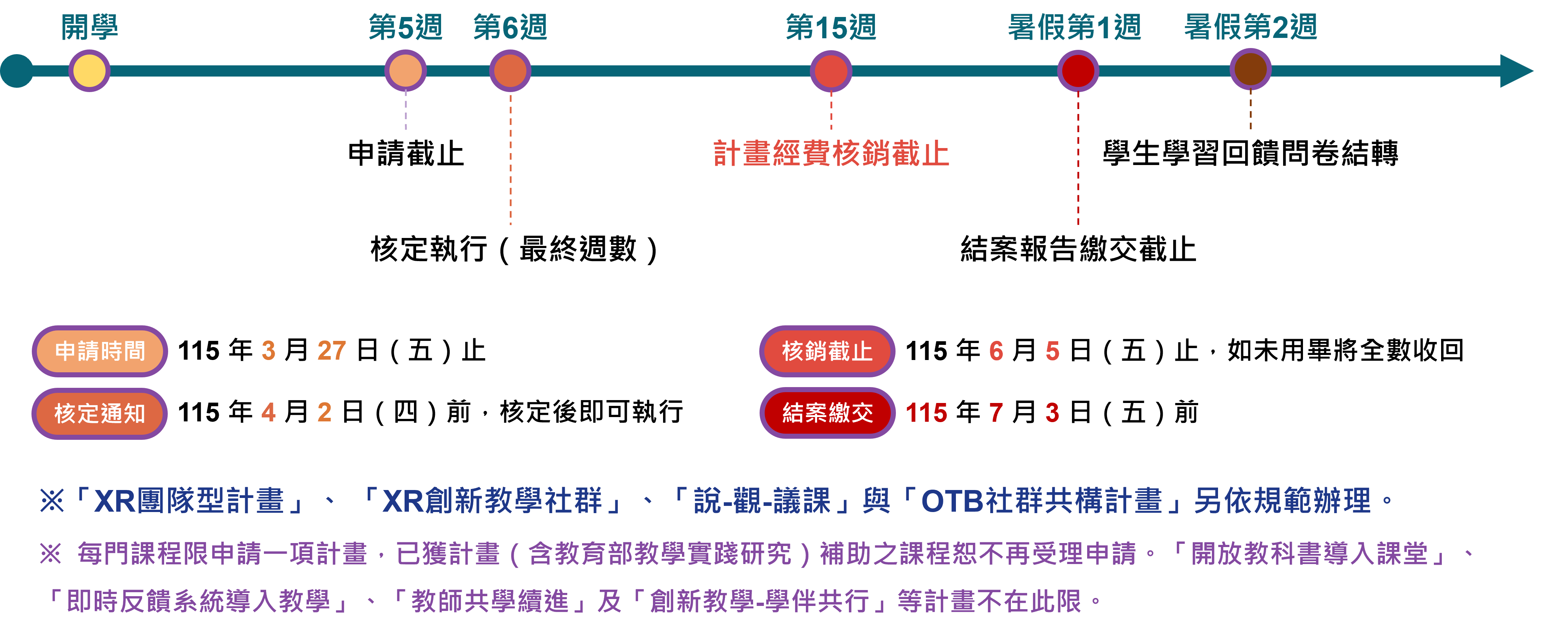 114-2 持續加碼開展「創新教學計畫 & 增能共學模式」,讓您持續提升學生學習成效!,計畫重點時程如下圖: